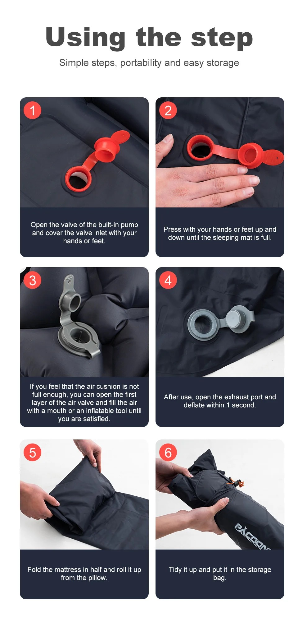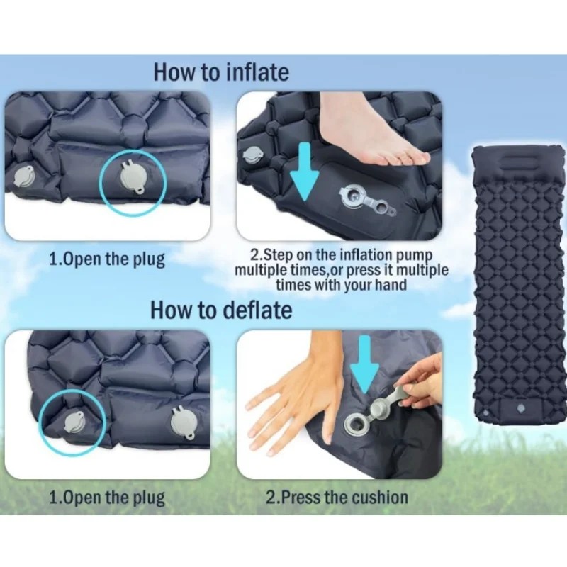 Say goodbye to the trouble of hand pumping. No longer need to inflate with your mouth, hands, or carrying a pump, just step on the air intake at the bottom of your camping sleeping mat for 30 seconds to inflate. The leak-proof membrane ensures worry-free use, while fast deflation adds to the convenience of preparing you for outdoor sleep.